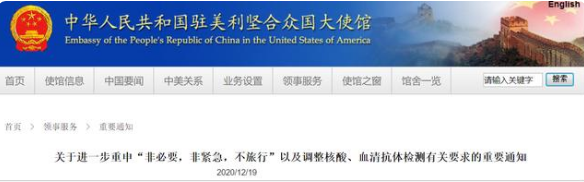 中國駐美國大使館12月19日發(fā)布通知,近期從美國輸入中國的新冠確診病例大量增加,經(jīng)查,多數(shù)確診病例與旅途中轉(zhuǎn)感染有關(guān),部分也與中介機(jī)構(gòu)、實(shí)驗(yàn)室存在違規(guī)操作以及檢測后不能遵守居家隔離要求有關(guān)。截至12月18 日,美國疾病控制與預(yù)防中心(CDC)統(tǒng)計(jì)的美國確診病例已近1700萬例,CDC并預(yù)計(jì)2021年1月初仍可能會(huì)有每周120萬至230萬例新增報(bào)告病例。為保護(hù)中外乘客和航空公司乘務(wù)人員健康和生命安全,筑牢外防輸入防線,根據(jù)國內(nèi)******要求,駐美國使領(lǐng)館現(xiàn)再次提醒大家慎重考慮疫情期間的感染風(fēng)險(xiǎn),務(wù)必牢記“非必要,非緊急,不旅行”。同時(shí),對確有緊急旅行需要的乘客進(jìn)行新冠病毒核酸檢測、血清抗體檢測相關(guān)要求作出進(jìn)一步規(guī)范和說明: